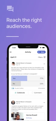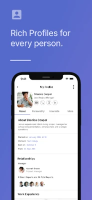 Structural brings together your people data to create a more agile, connected, and productive enterprise. Rich profiles allow everyone in your organization to access the full breadth available talent by surfacing skills, experience, contact details, reporting structures, and more. Structural’s built-in communication and segmentation tools allow you to send the right messages to the right audiences and collect feedback in real time. Plus, smart notifications and on-demand resources keep you up to date with internal milestones, birthdays, policies, and company news.